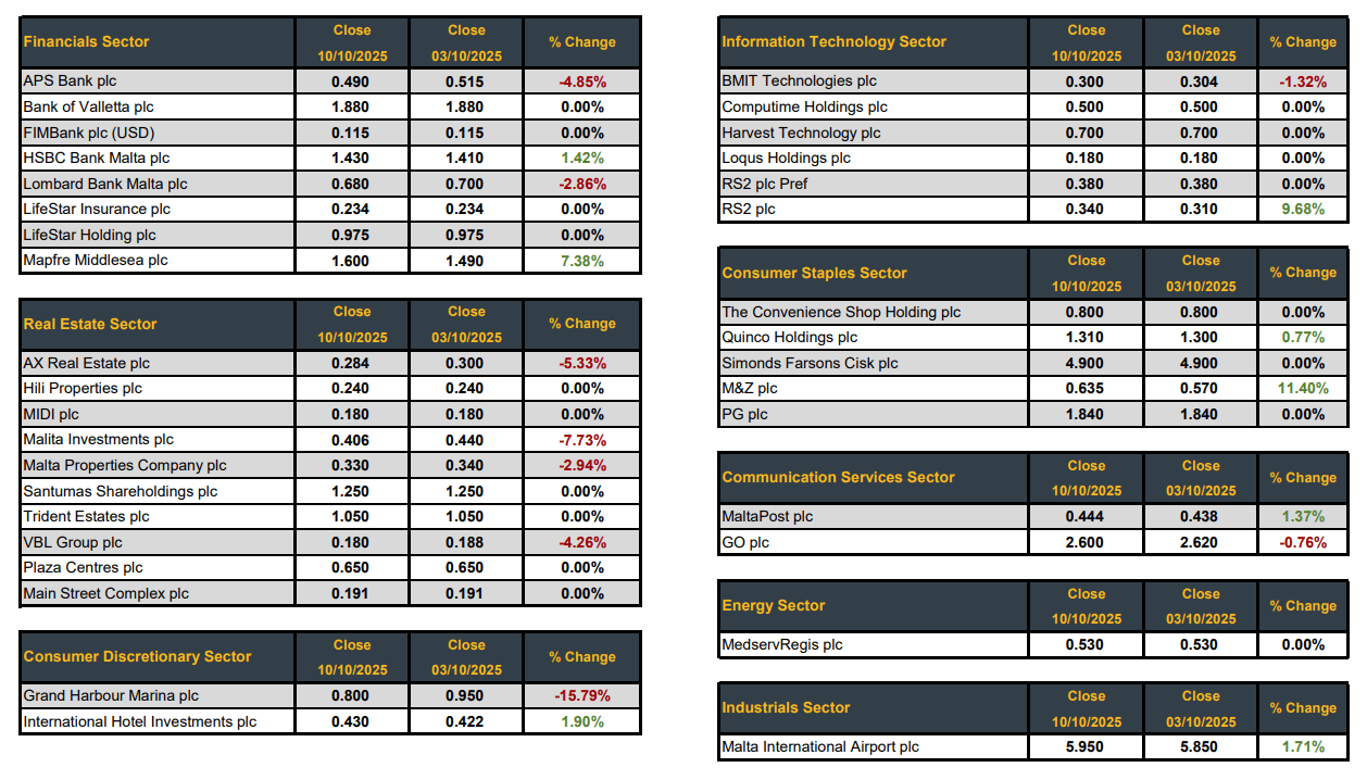 Lombard Bank Malta plc faced a challenging week, slipping 2.9% to close at €0.68. The equity was involved in three trades, with prices varying between a weekly high of €0.69 and a low of €0.66. Market activity consisted of 31,691 shares changing hands, resulting in a weekly turnover of €21,674.