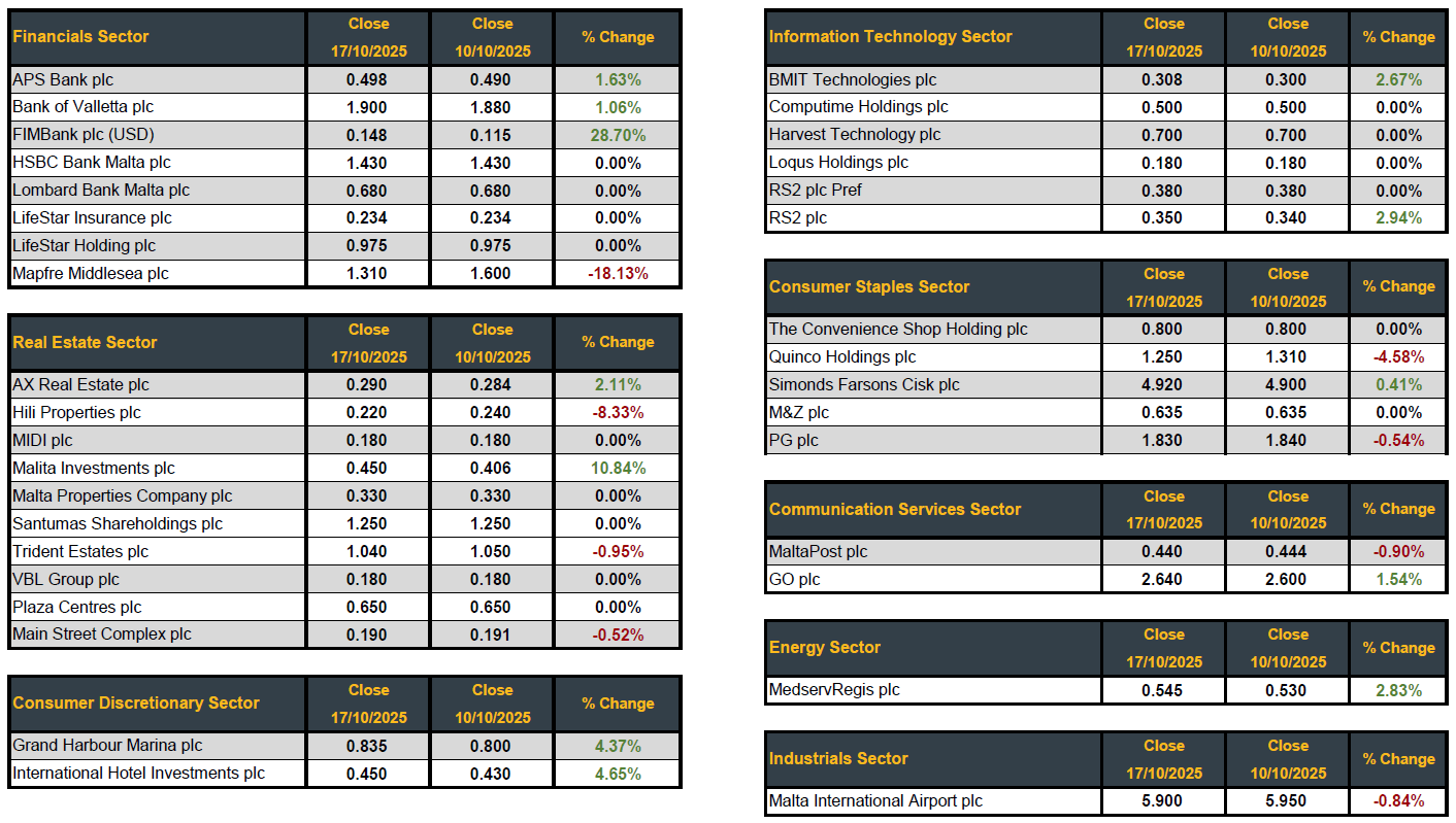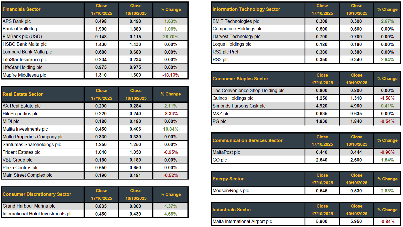 In the banking sector, Bank of Valletta plc (BOV) closed higher by 1.1% to close at a weekly high of €1.9. The equity was the second most liquid, consisting of 45 trades of 150,113 shares, generating a total of €283,038 in turnover.