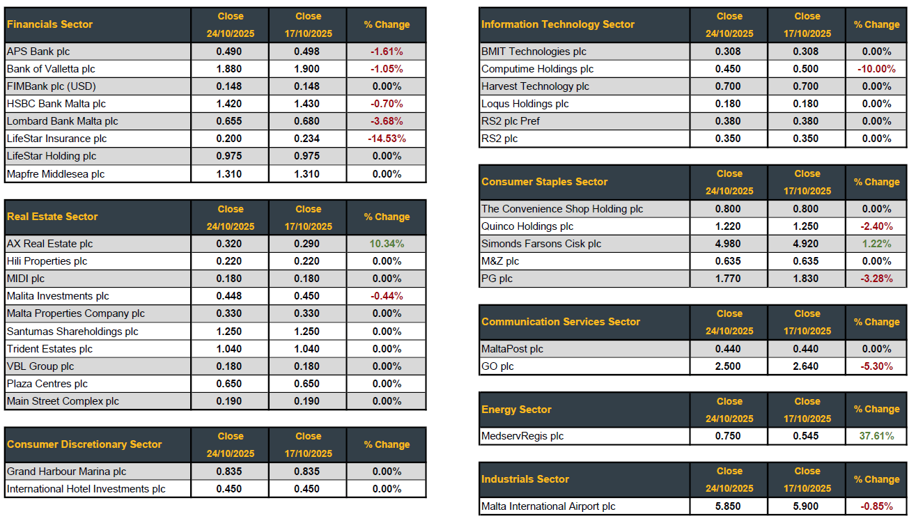 Finally, in the banking sector, Lombard Bank Malta plc tumbled 3.7%, closing at a weekly low of €0.655. Trading activity was limited to just one deal, spread across 3,516 shares, for a total trading value of €2,303.