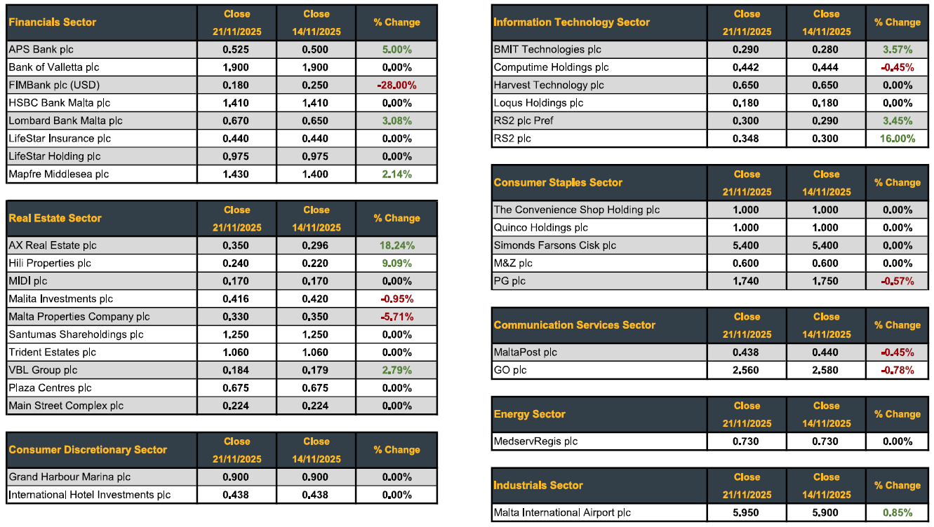 Meanwhile, Mapfre Middlesea plc registered a gain of 2.1%. The equity traded at a weekly low of €1.20 before rising to €1.43. Activity was spread across five transactions, with 22,240 shares exchanged for a total turnover of €26,706.